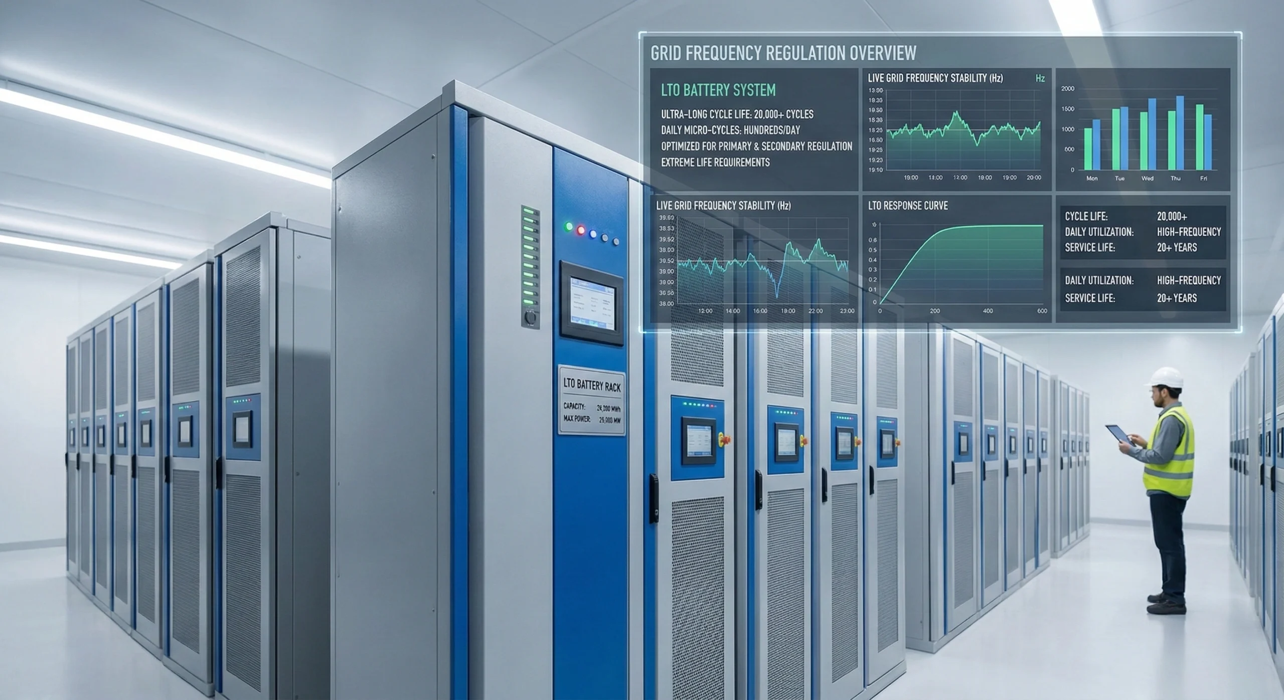 Stabilize grid infrastructure with unparalleled cycling capability. DLCPO LTO solutions handle millions of high-power micro-cycles for superior frequency regulation, peak shaving, and voltage support with a 20+ year operational life.