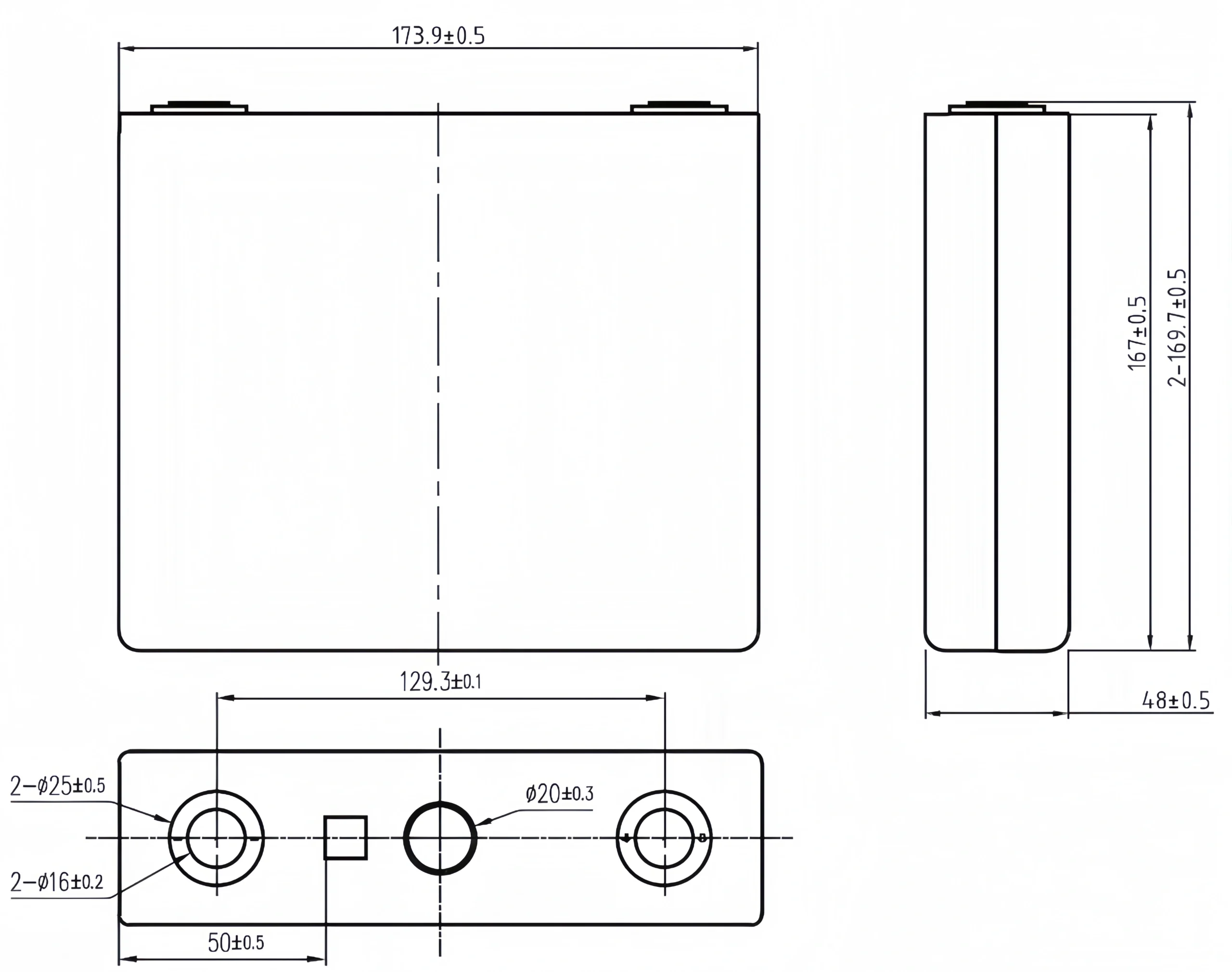 A: The CALB L173F120A features a precision body size: width is 173.9 plus or minus 0.5 mm, thickness is 48 plus or minus 0.5 mm, and the total height including terminals is exactly 169.7 plus or minus 0.5 mm. The distance between terminal centers is 129.3 plus or minus 0.1 mm.