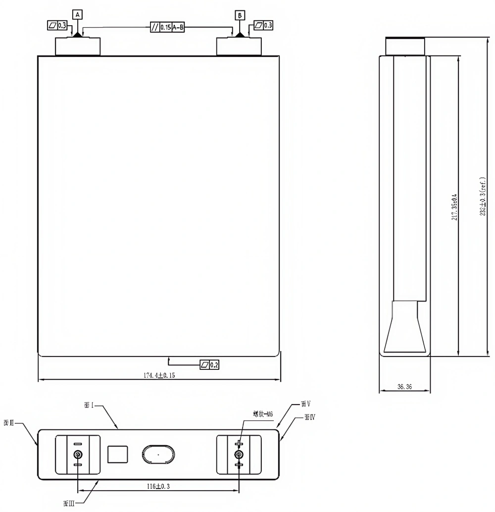 A: The CALB L173F163A features a precision slim profile: length is $174.4 \pm 0.15$ mm, total height (including terminals) is $232 \pm 0.3$ mm, and thickness is $36.36$ mm. The terminal center-to-center distance is $116 \pm 0.3$ mm.