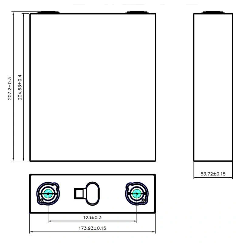 A: The CALB L173F230 features a precision body size: length is $173.93 \pm 0.15$ mm, thickness is $53.72 \pm 0.15$ mm, and the total height with terminals is $207.2 \pm 0.3$ mm. The terminal center-to-center distance is $123.0 \pm 0.3$ mm.