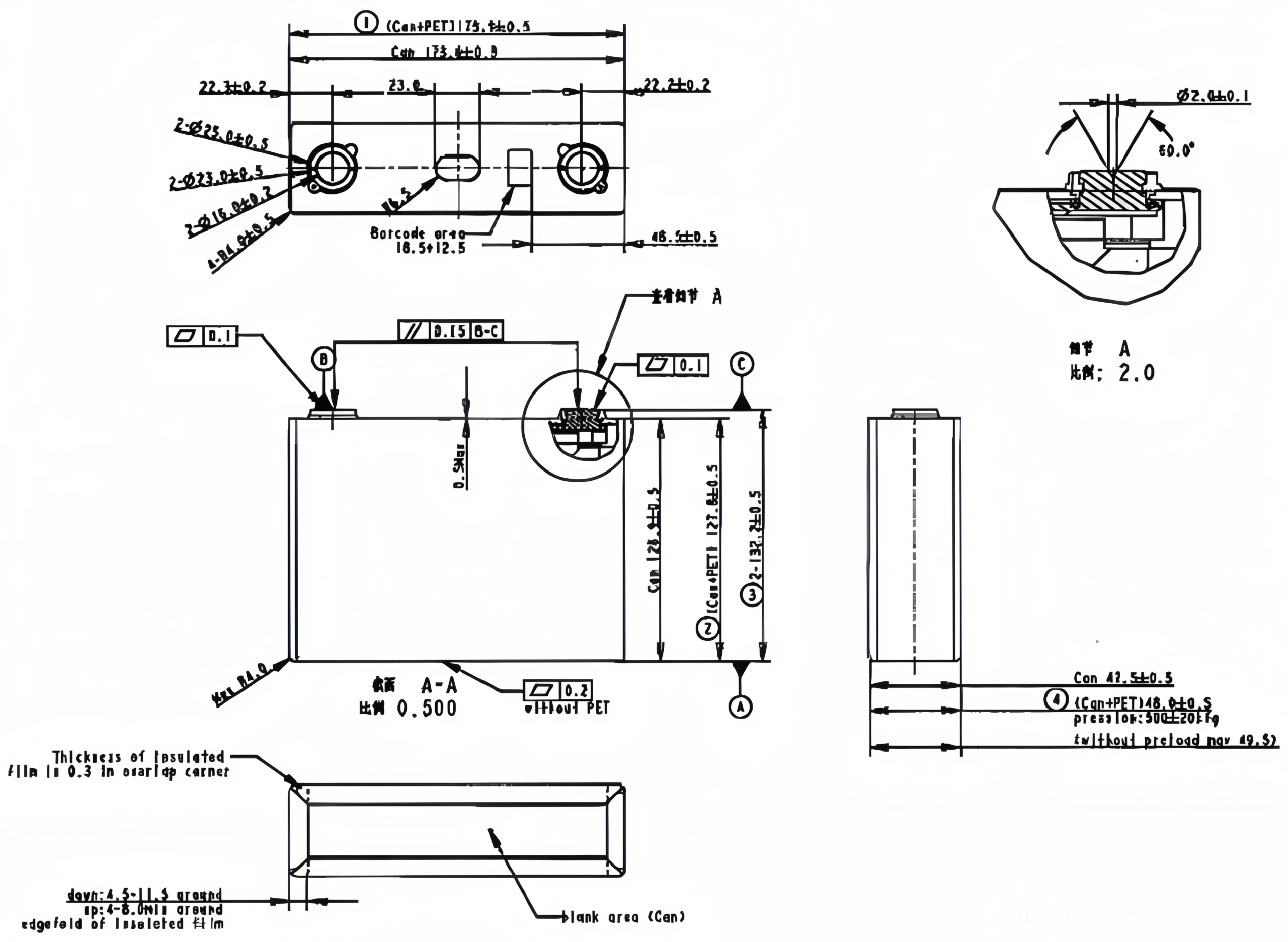 As per the technical drawing, a pressure of 500 ± 20 kgf is recommended when building modules to ensure long-term stability and prevent internal cell expansion during heavy cycling.