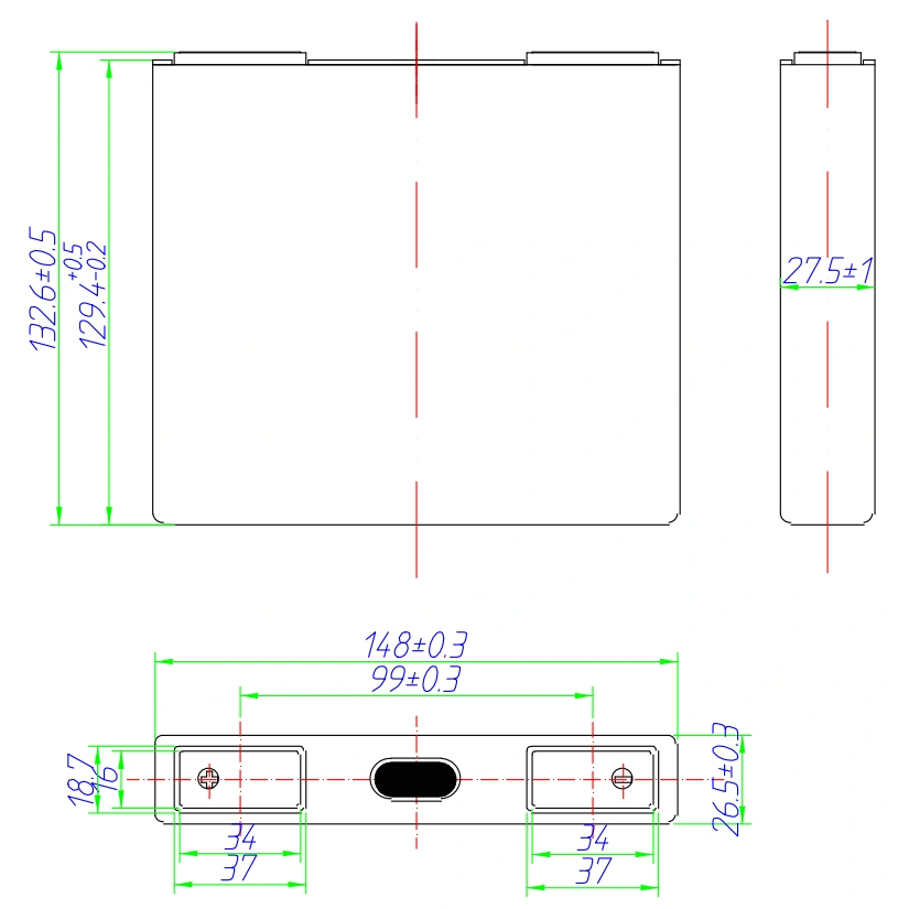 The cell body measures 148mm wide, 130mm high, and 27.5mm thick. Please note that the total height including the terminals will be slightly more (approx. 132.6mm). Its slender 27mm profile is its greatest mechanical advantage.