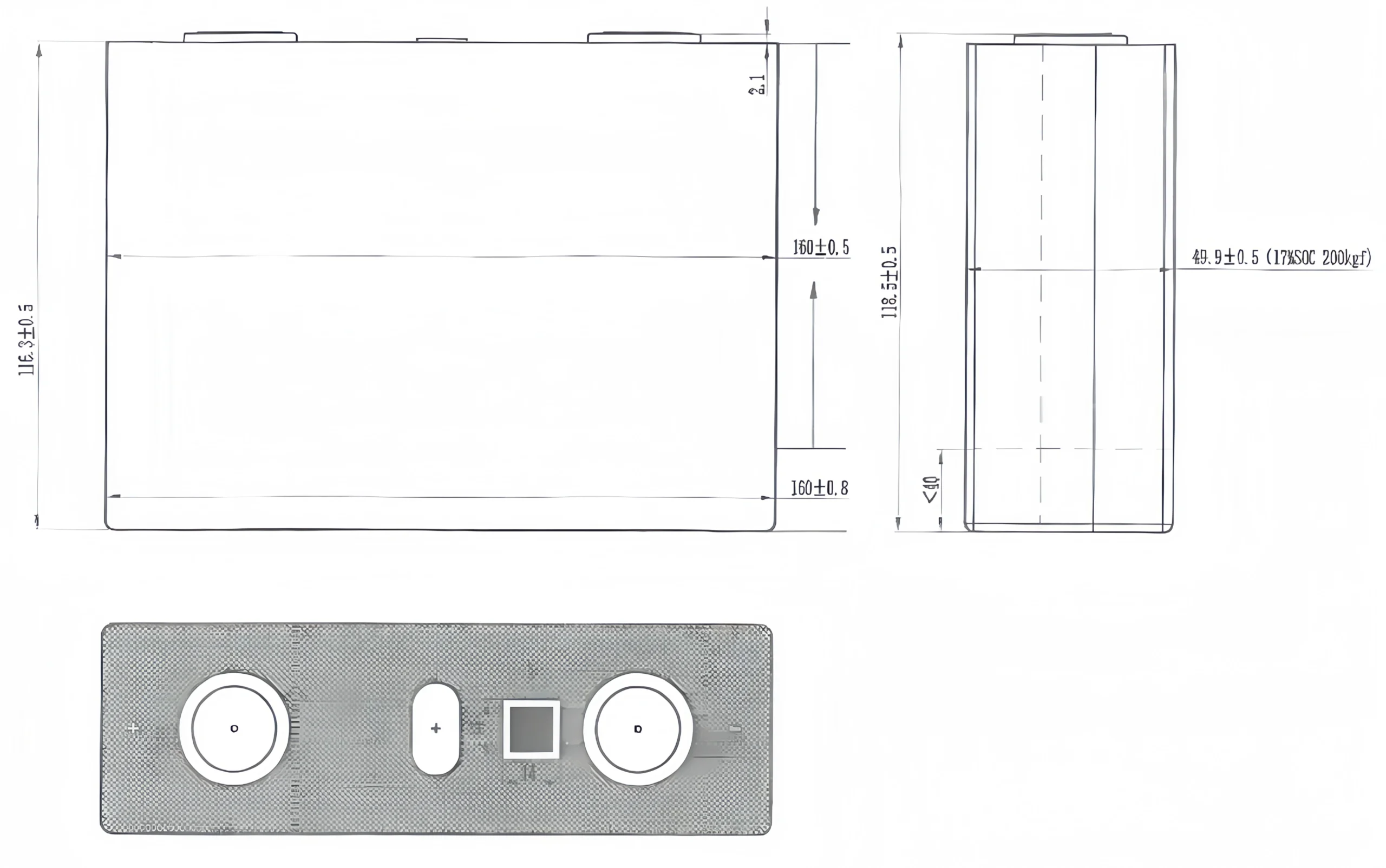 Each cell measures 50.2mm (T) x 160.2mm (W) x 118.5mm (H). Please ensure your battery enclosure accounts for busbar clearance and terminal height when designing your system.