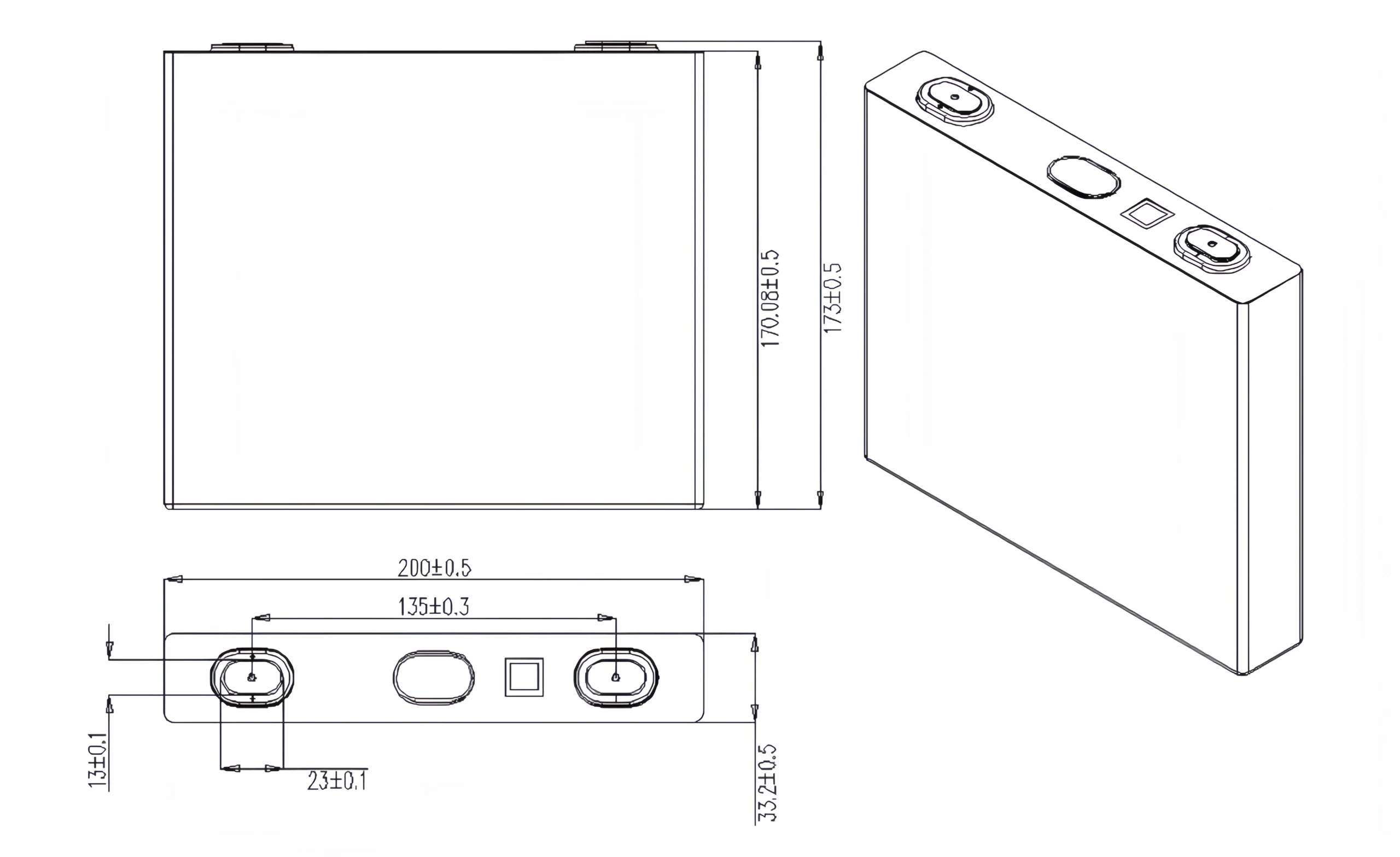 The cell shares the standard 173mm width but is slightly taller at 173mm. Because of its slim 33.2mm profile, it allows you to pack 25% more energy into nearly the same footprint as a 100Ah cell, ideal for space-constrained RV and marine builds.